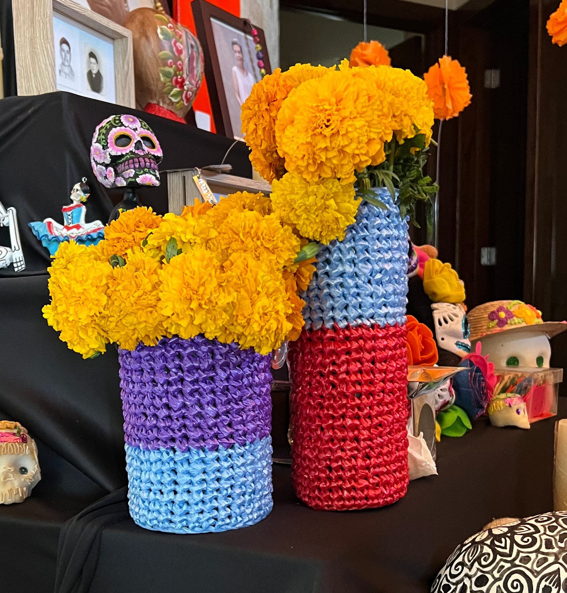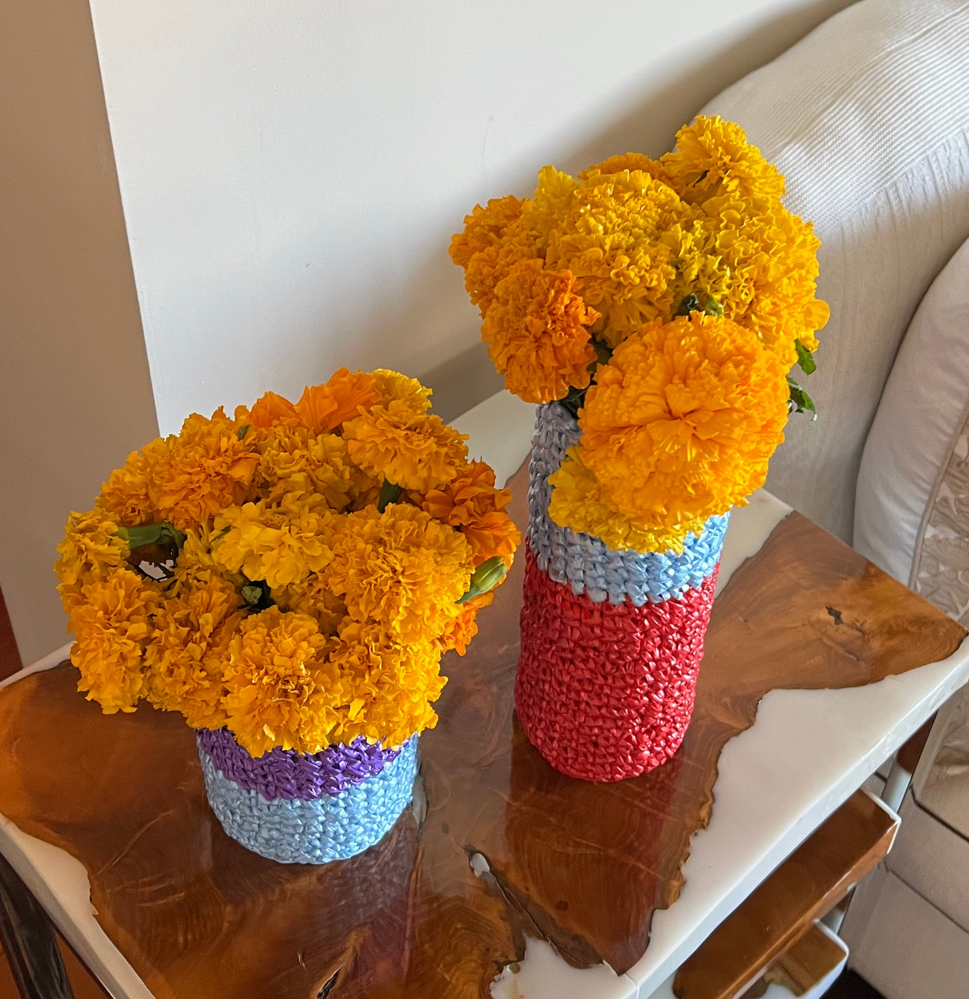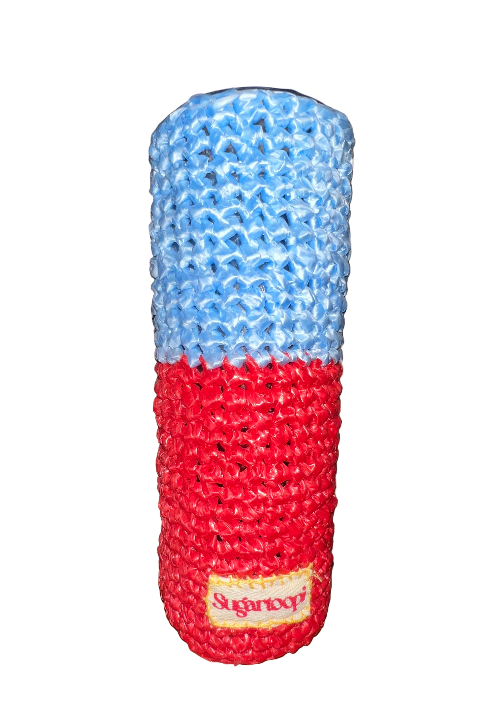 Jarrón de vidrio envuelto en raffia azul y roja.
