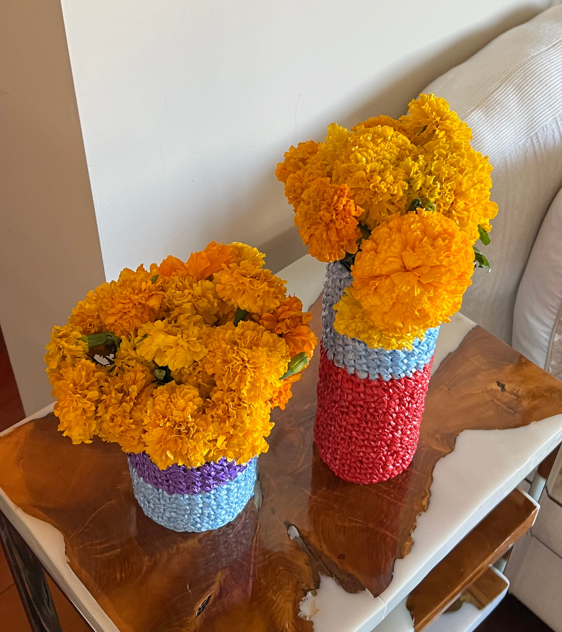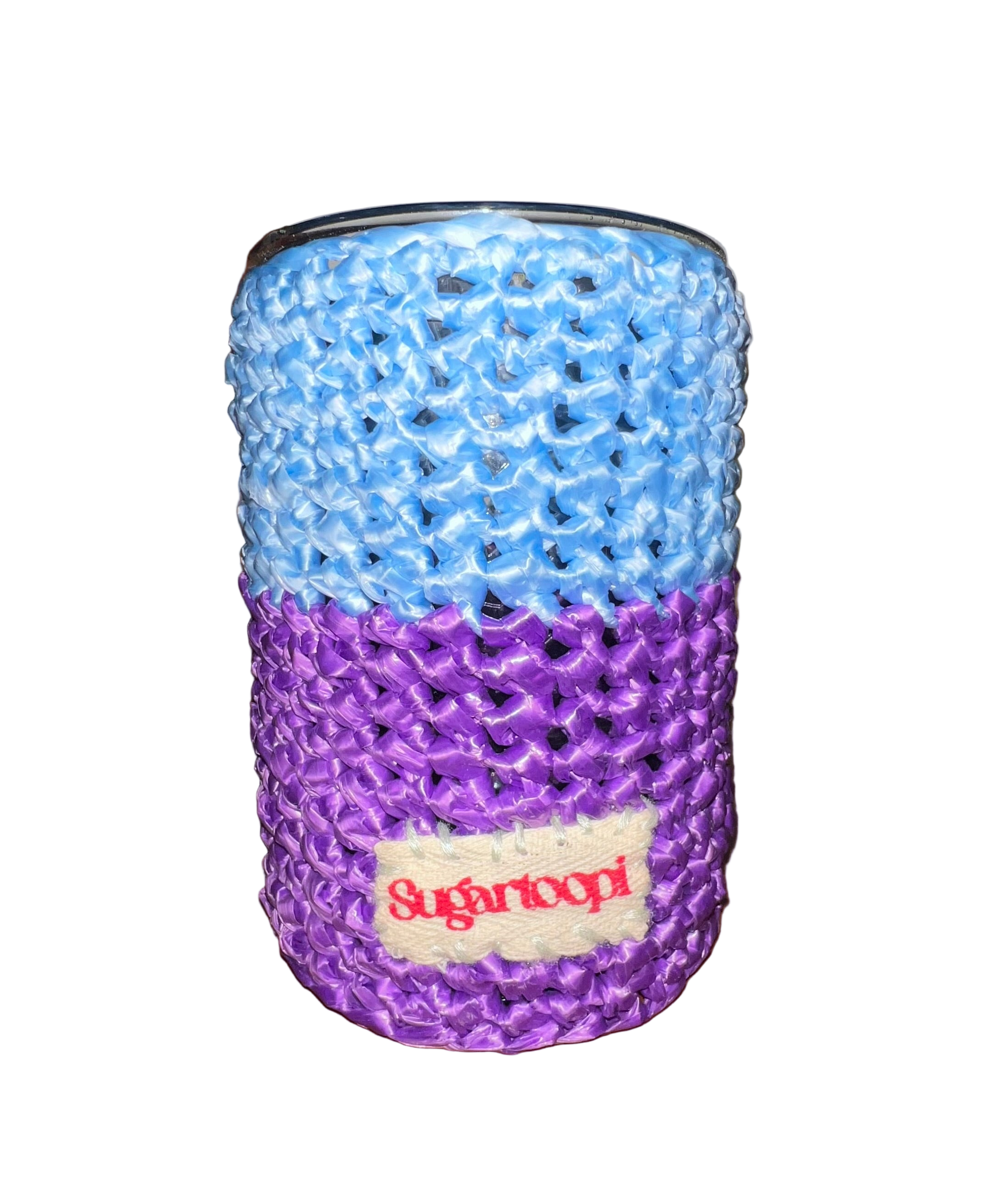 Jarrón de vidrio envuelto en raffia azul y morada.